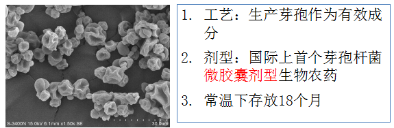 微生物包裹在微膠囊內,抗逆性強,貨架期長,效果穩定;克服了生物農藥常溫下不能長期存放的技術瓶頸。